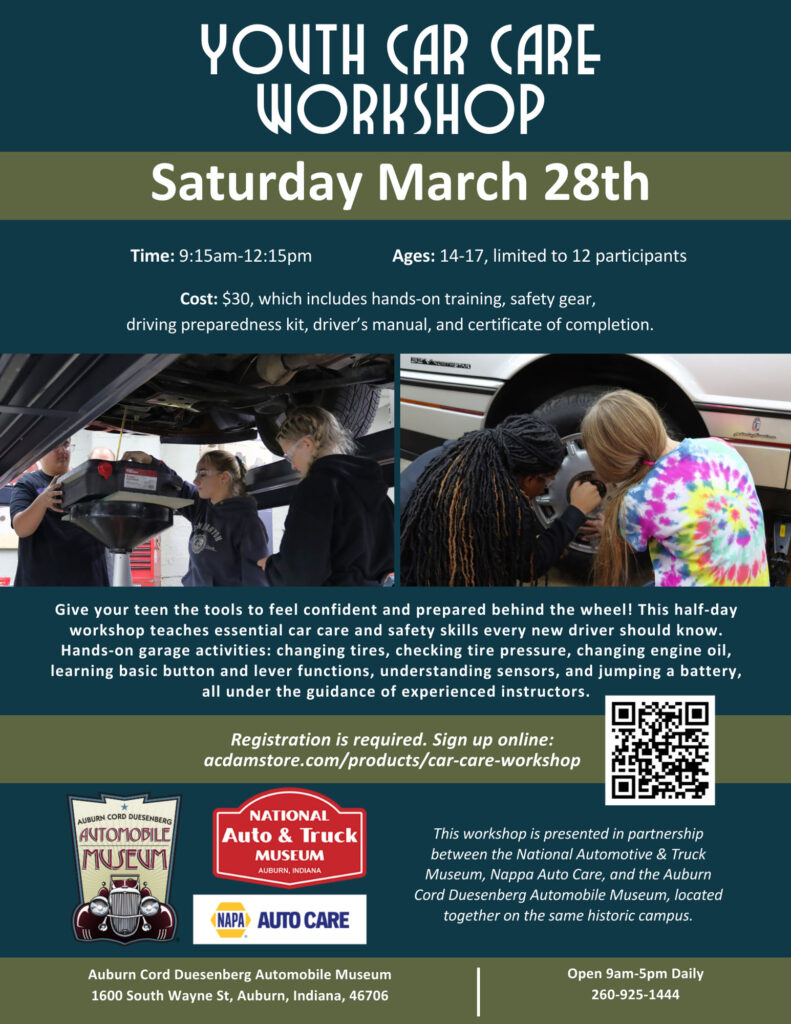 Join us for an empowering workshop hosted in collaboration with the National Automotive & Truck Museum and the Auburn Cord Duesenberg Automobile Museum, both on the same historic campus! Equip your teen with the confidence and skills essential for safe driving. This engaging half-day workshop covers vital car care and safety techniques every novice driver should master. Participants will take part in hands-on garage activities, including changing tires, checking tire pressure, changing engine oil, navigating basic buttons and levers, understanding sensors, and learning how to jump a battery—all guided by experienced instructors.